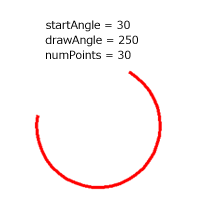 引数 startAngle と drawAngle は時計回りで、マイナスを指定した場合は反時計回りとなります。また、±360