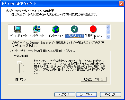 上記画面では、「信頼済みサイト」を選択して、アセンブリの信頼レベルを、一番上までスライドして「完全な信頼」に設定します。「次へ」ボタンを押します。 |