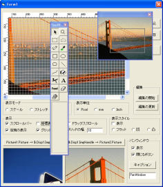 現在表示されているディスプレイコントロールとは別のウィンドウ(パンウィンドウ)にそのイメージ全体と全体での位置枠を表示し、ディスプレイコントロール上のイメージ表示範囲とパンウィンドウ上のイメージ位置枠をお互いの動きに連動して移動します。この機能を利用することで、ディスプレイコントロールに表示しきれないイメージの全体に対する位置確認をしながら操作を進めることができます。ベクトルデータのパンウィンドウもサポートしました。