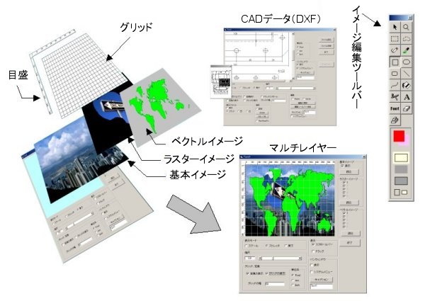 JPEGなどのラスターイメージデータとDXF図面データなどとの相互運用を考えたアプリケーションの作成が可能